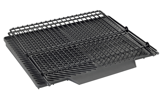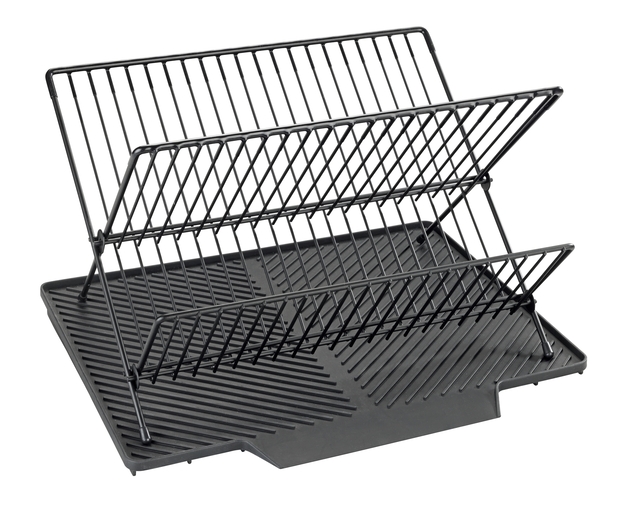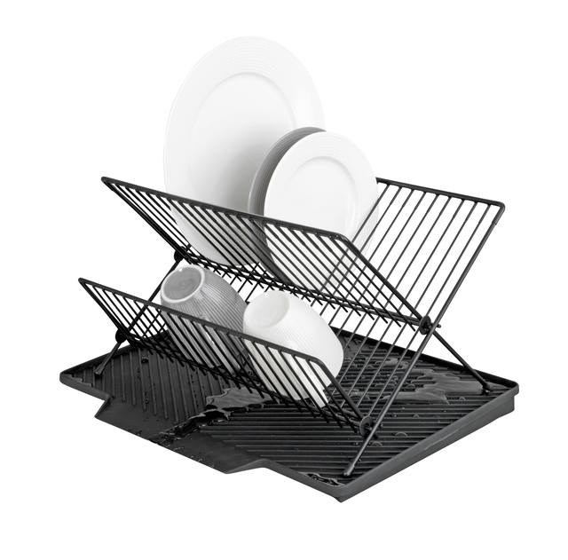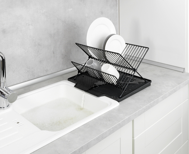 Auf 2 Etagen bietet der Geschirrabtropfer jede Menge Platz für Teller, Tassen & Co.: Auf der oberen Ebene lassen sich bis zu 21 Teller zum Trocknen ablegen. Der gummierte Rand hält Geschirr sicher und schonend fest. Die ausklappbare, untere Ebene lässt sich mit bis zu 4 normalen Tassen, 5 Gläsern oder wahlweise mit kleineren Schüsseln und bis zu 21 Untersetzern ebenfalls großzügig bestücken. Mit rutschhemmenden Standfüßen. Die Abtropfmatte mit geneigter Fläche und Ablaufrinnen mit "Ausgießer" sorgt für einen optimalen Wasserablauf. Das Wasser kann direkt in die Spüle abfließen, Geschirr und Besteck trocknen schneller. Die strukturierte Oberfläche der Matte sorgt zusätzlich für eine gute Luftzirkulation und begünstigt den Trocknungsvorgang. Ideal zur seitlichen Erweiterung des Spülbeckens, die Arbeitsfläche bleibt sauber und trocken. Geschirrabtropfer und Abtropfmatte auch separat zu benutzen. Platzsparend zusammenklappbar.