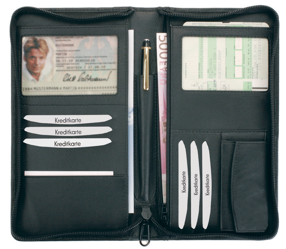 • Fächer für Personalausweis / Führerschein, Reisepass, 7 Visitenkarten- bzw. Kreditkarten