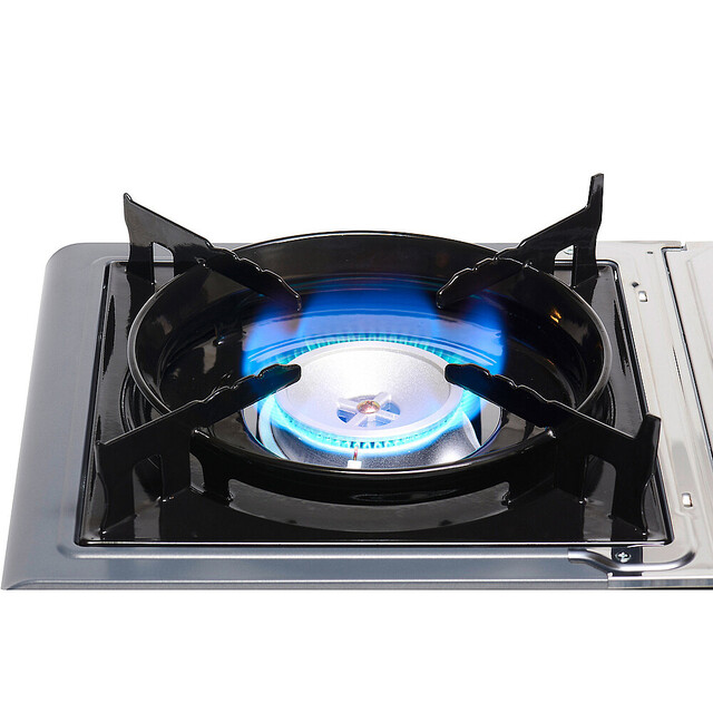 Kompakter leichter Campingkocher mit Piezozündung, Dual Safety System und Topfträger aus emailliertem Stahl.