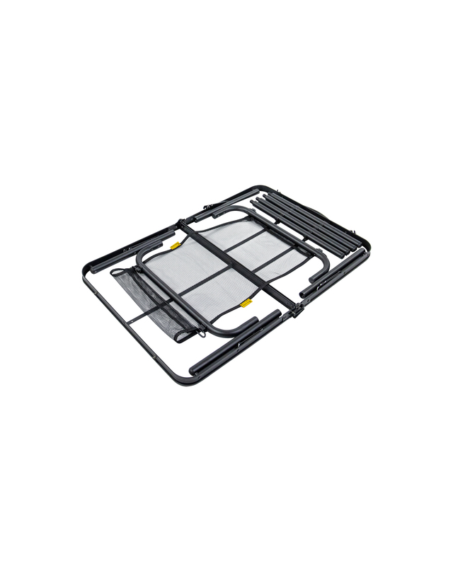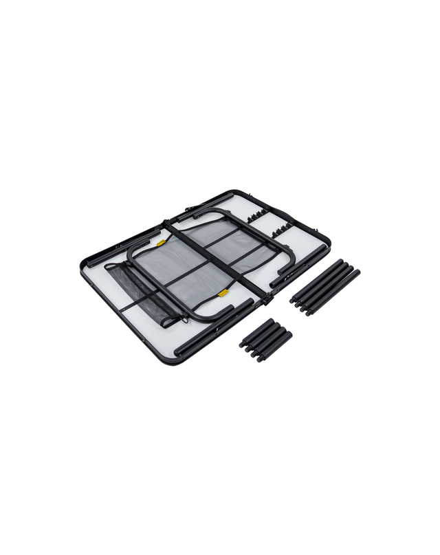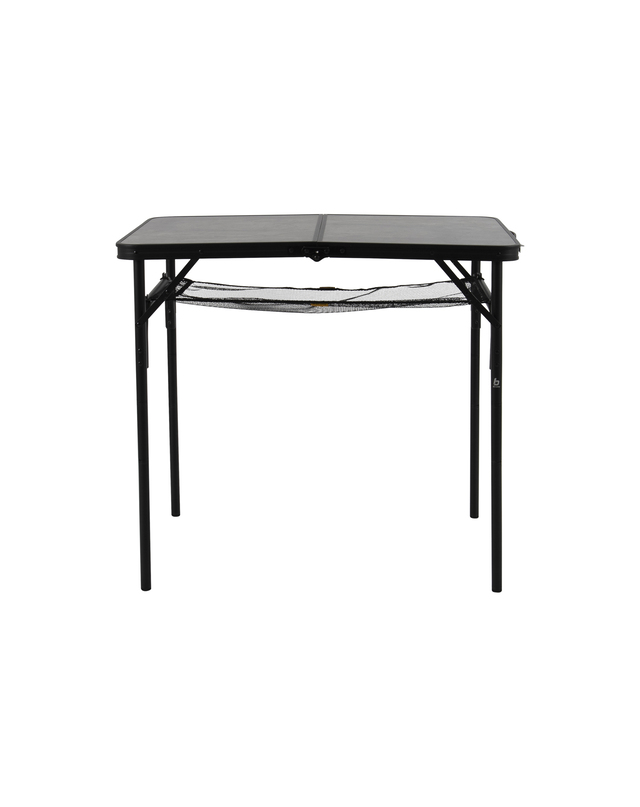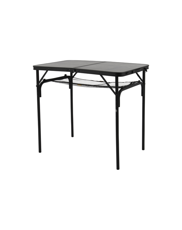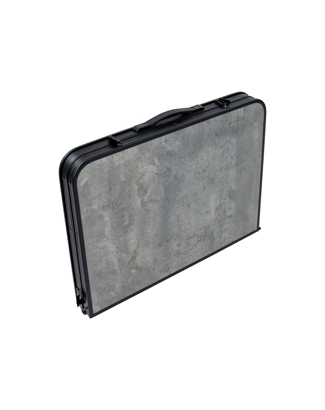 Ein stilvoller Aluminiumtisch mit Industrieoptik und Tischplatte in Betonoptik. Mit Hilfe der Stellschrauben können die Tischbeine an einen unebenen Untergrund angepasst werden. Außerdem ist der Tisch durch die abnehmbaren Beine und eine teilbare Platte sehr kompakt als Koffermodell zu verstauen. Der Tisch ist mit einem Netz unter der MDF-Tischplatte ausgestattet, um Gegenstände aufzubewahren, und mit einem Griff, der das Tragen des Tisches erleichtert. Der Tisch ist in der Höhe verstellbar: 35/50/67/81 cm. Maße zusammengeklappt 64 x 49 x 8 cm (B x H x T cm).