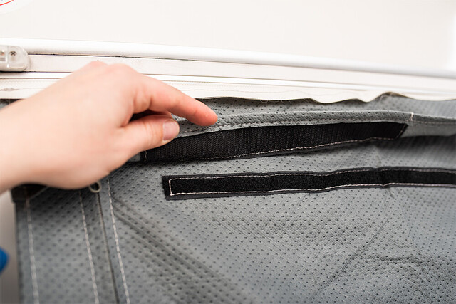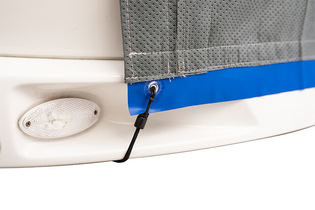 Im Winter hält die Bugschutzplane WINTERTIME den Flaschenkasten frei von Eis und Schnee und verhindert mögliche Zugluft. Die Schutzplane verfügt über einen Textilkeder mit 7 mm Durchmesser, der lediglich in die Kederschiene eingezogen wird. Am unteren Rand sind Ösen zum Abspannen vorhanden.