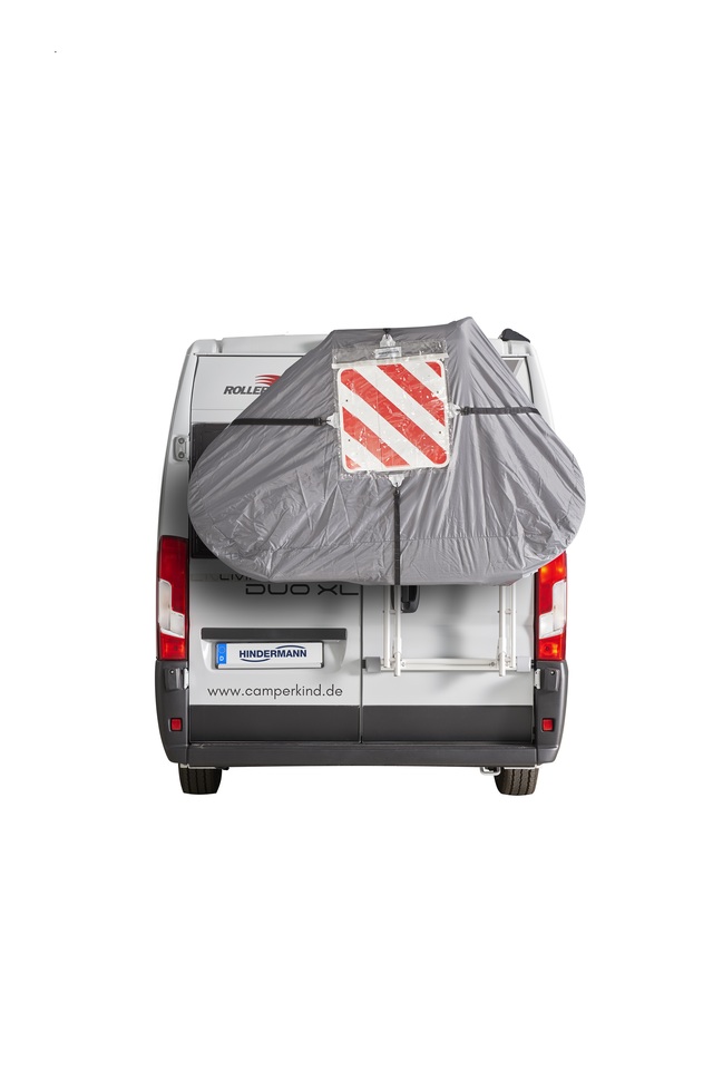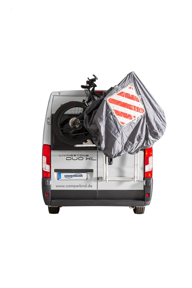 Hochwertige Schutzhülle, die von der Rückfront zum Fahrzeug hin aufgezogen wird und somit auch die Unterseite des Fahrradträgers vor Verschmutzungen schützt.