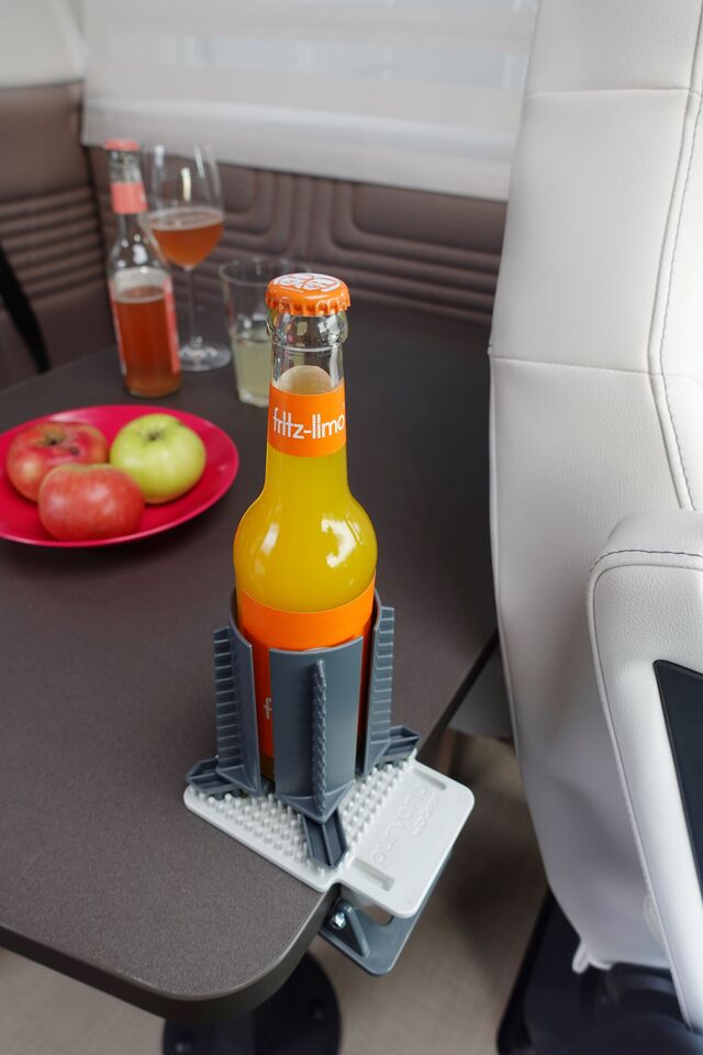 Zwei Platten mit integriertem Abstandshalter sorgen für einen sehr guten, waagerechten Halt an der Kante eines Tisches. Der CLIP CLAP wird an die Tischkante festgeklemmt. Die obere Standfläche ist mit einer Noppenplatte ausgestattet und bietet so einen sicheren Stand für die Aufsätze von purvario: den Flaschen & Glashalter FLEXXI 100 und den Stilglashalter IVY. So kann auch während einer Fahrt ein Getränk, ob Flasche, Glas oder Tasse am Tisch befestigt werden ohne dass es kippt oder rutscht. Dafür sorgt zudem noch eine Anti-Rutsch-Fläche an den Aufliegeflächen des Clip Claps zum Tisch.