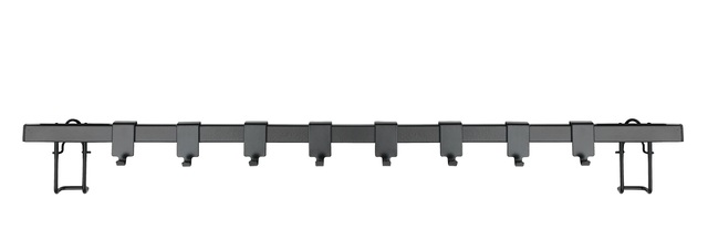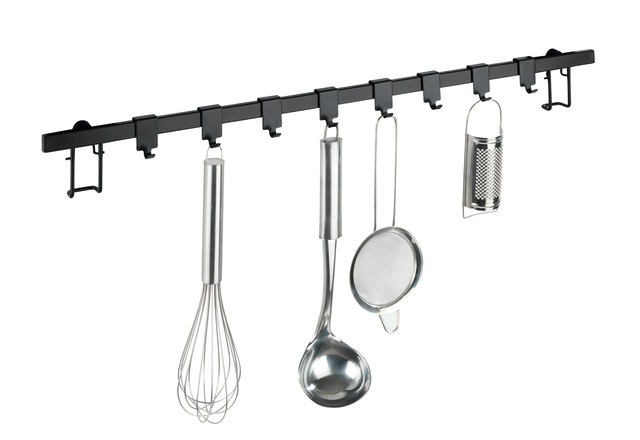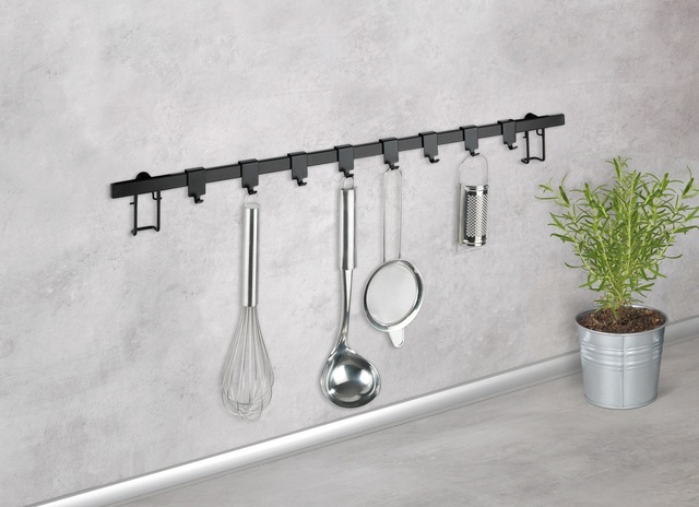 Hakenleiste mit 8 Haken für Ordnung in der Küche. Elegantes Design dank schwarzem Flachstahl. Alternative Befestigung ohne Bohren möglich.