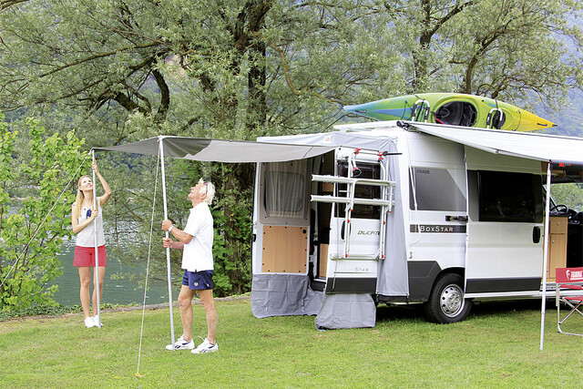 In wenigen Handgriffen montiert, mit seitlichen Abschlüssen und aufrollbarer Front für noch mehr Dichte. Obere Spannstange Rafter und Kederleiste, um die Spannung zu halten. Die Doppelkederschiene wird an der Dachtraufe des Ducato angebracht, die Aluminiumspannstange Rafter blockiert die Öffnung der doppelten Hecktür und spannt dabei das Sonnendach.