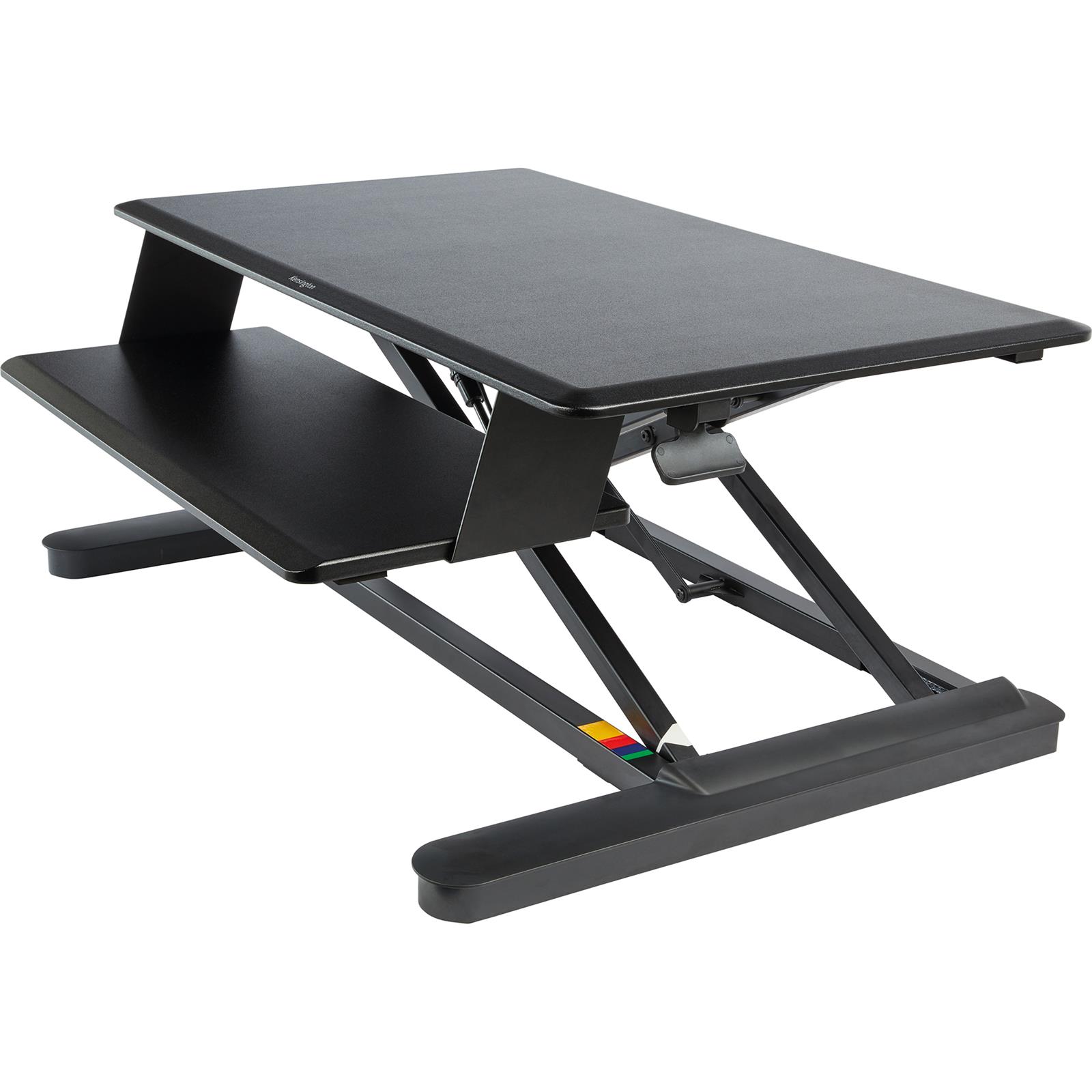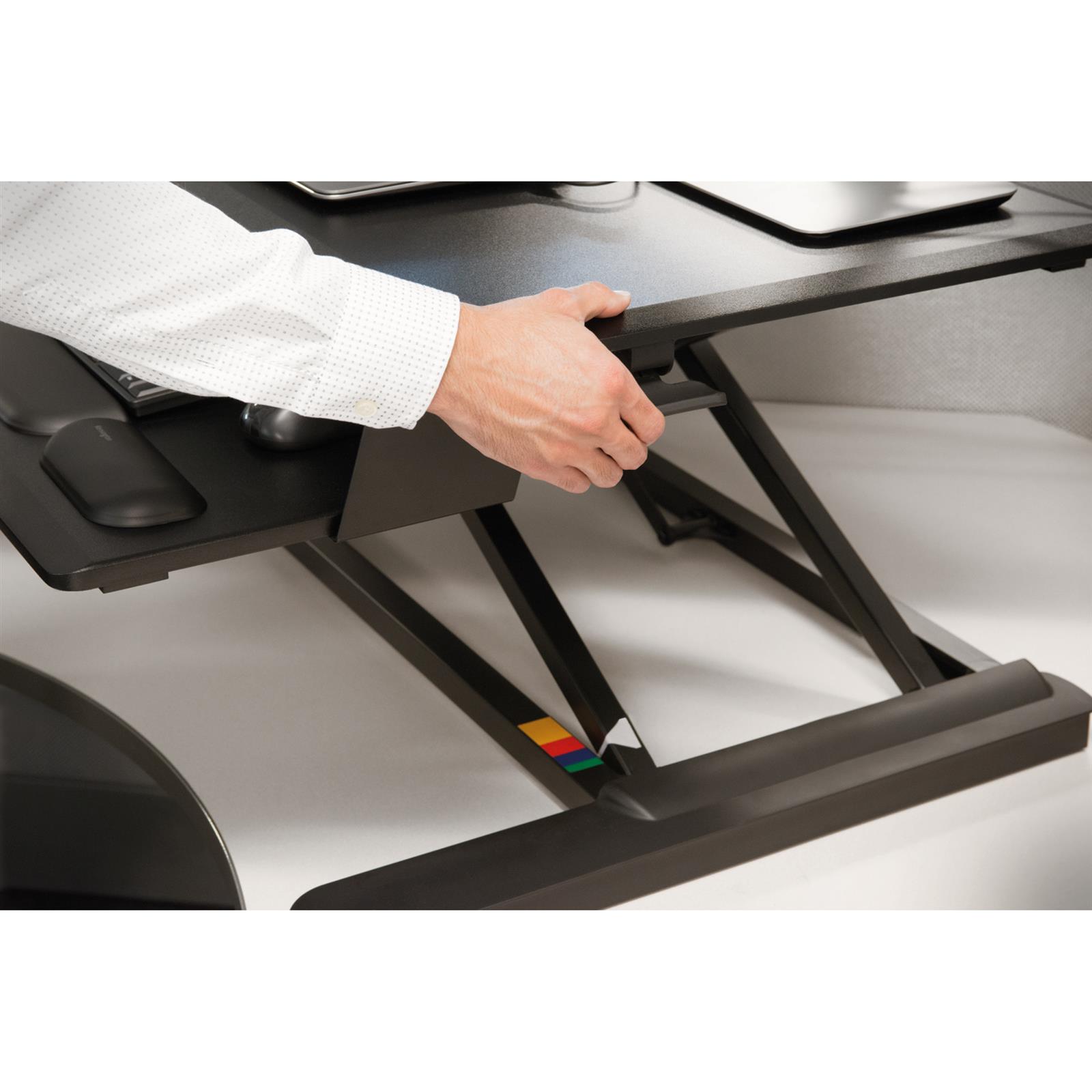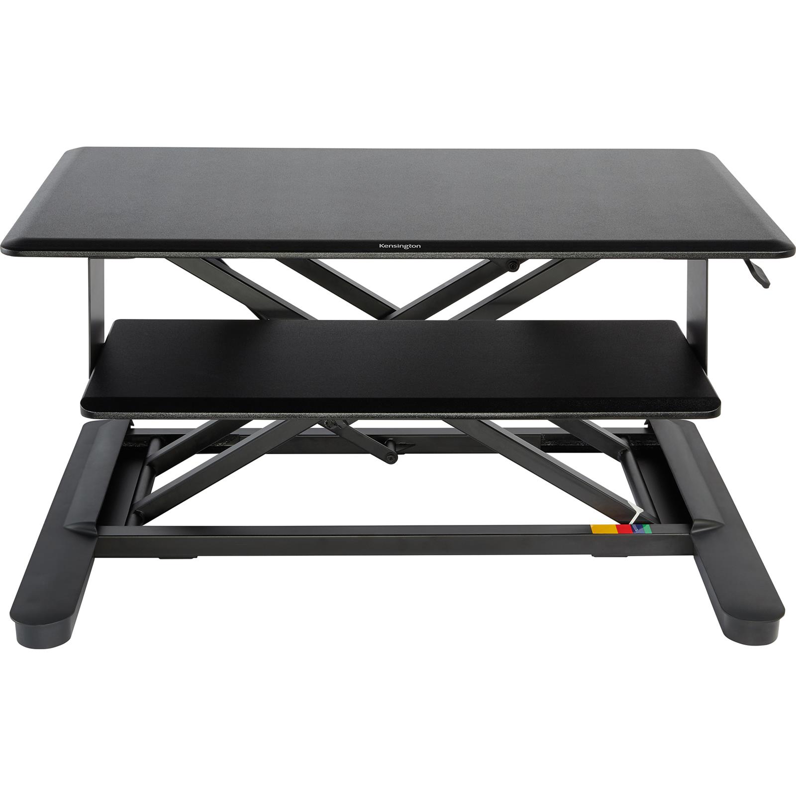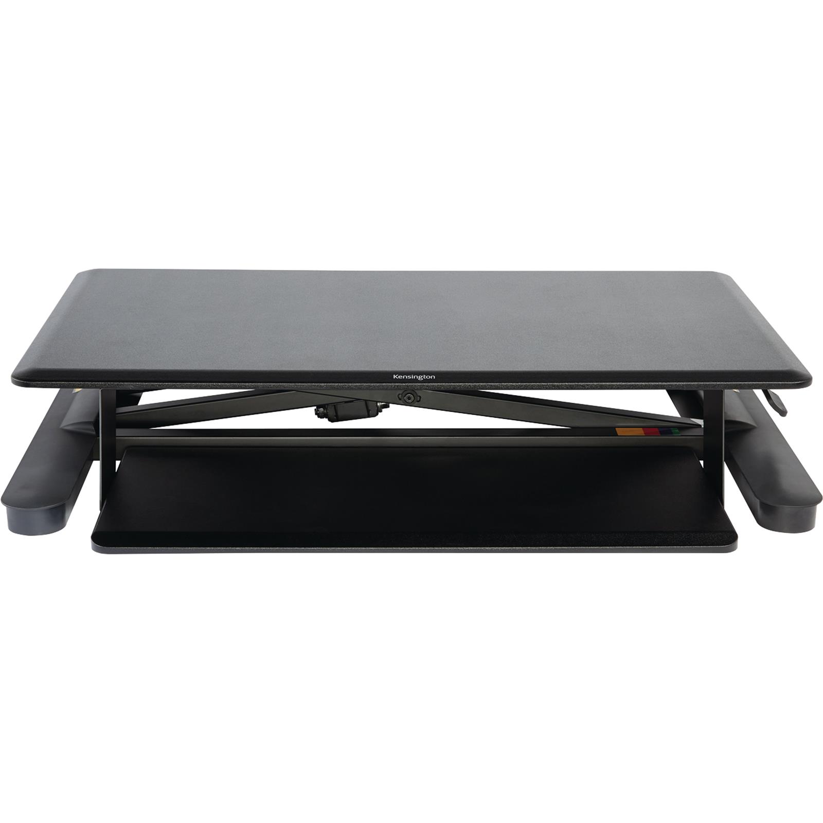 Kensington® Sitz-/Stehtisch. Mit SmartFit-System: Abmessen, Anpassen und Überprüfen. Mit zwei Ablageflächen: kleinere Ablage für Tastatur- und Maus und ein große Ablage für Monitor, möglich sind sogar 2 Monitore. Ergonomisch entworfene, abgeschrägte Kanten für verringerten Auflagedruck. Pneumatischer Hebevorrichtung (Gasdruckfedern) mit Spannungseinstellung ermöglicht die problemlose Anpassung an den Arbeitsplatzes für eine weiche und mühelose Einstellung zwischen sitzender und stehender Position. Kabelkanal erleichtert die Kabelführung und verhindert Kabelsalat. Vollständig montiert. VESA-Befestigungsplatte (K33959WW) und Dockingstation sind separat erhältlich. Höhenanpassung: 160 - 580 mm. Tragkraft: gesamt 15,9 kg, große Ablage bis zu 13,6 kg, kleine Ablage bis zu 2,3 kg. Material: Metall/Kunststoff. Format: 900 x 160 x 700 mm. Gewicht: 24,4 kg. Farbe: schwarz.