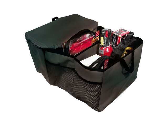 Die Kofferraumtasche dient zum sicheren Transport von Einkäufen, Gepäck, Kinderspielzeug, Werkzeug oder dem Warndreieck. Der faltbare Organizer mit zwei praktischen Tragegriffen an den Seiten passt in jeden Kofferraum und bietet bei Nichtgebrauch ein platzsparendes Verstauen. Die Tasche hat drei große Fächer, ein Netzfach inkl. einem Klettband zur einfachen Befestigung. Besonders geeignet ist der Organizer für Einkäufe aus dem Kühlregal oder für ein Picknick.