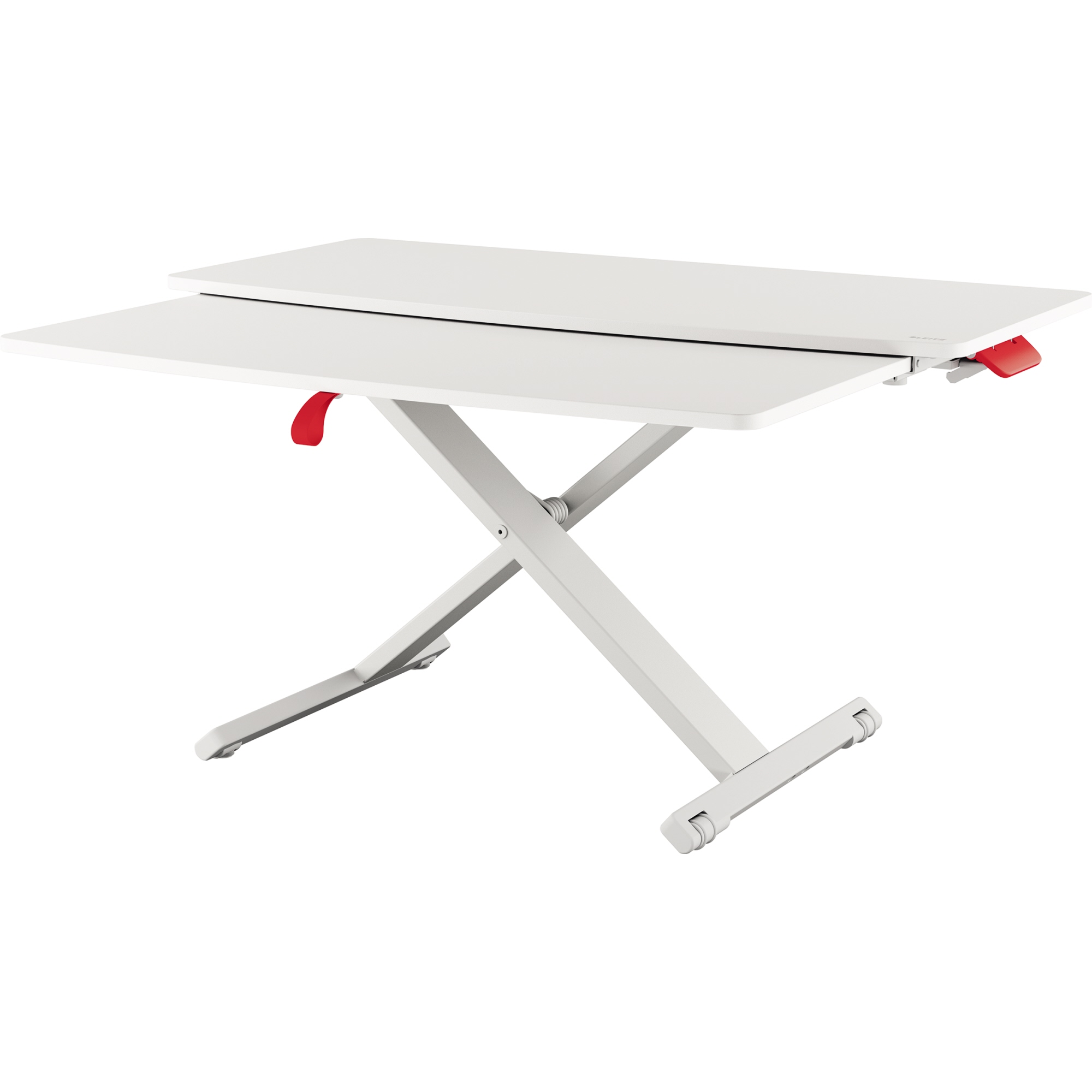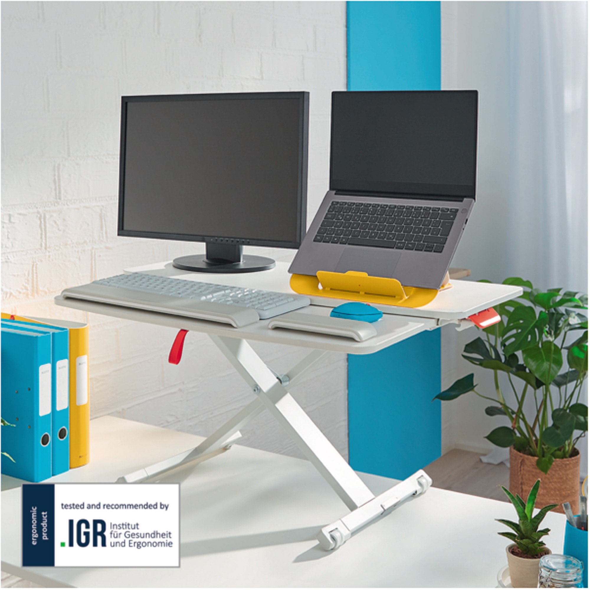 Leitz Schreibtisch-Aufsatz Ergo Cosy mit ausziehbarer Tastatur- und Mausablage. Pneumatisch unterstützte Höhenverstellung zum einfachen und mühelosen Wechsel zwischen Sitz- und Stehposition. Stabil und standfest. Der Wechsel zwischen Sitzen und Stehen führt zu verbesserter Muskelaktivität und einer besseren Körperhaltung. Die große Tischfläche eignet sich für einen Bildschirm und Laptop mit Ständer. Die ausziehbare Ablage bietet ausreichend Platz für die Tastatur, Maus und Handgelenkstützen. Platzsparende Stellfläche: 800 x 350 mm. Minimale Höhe 68 mm, maximale Höhe 447 mm. Tragkraft: bis zu 16 kg auf der Haupttischfläche und bis zu 8 kg auf der Tastatur- und Mausablage. Produkt wird komplett montiert geliefert. Kunststofffreie Verpackung. Material: Metall. Gewicht: 5,5 kg. Format: 800 x 68/108 x 400 mm. 5 Jahre Garantie. Farbe: grau.