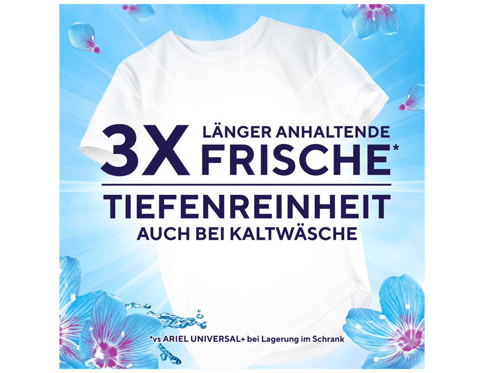 • bis zu 3-mal länger anhaltende Frische (gegenüber Ariel Universal+ bei Lagerung im Schrank)