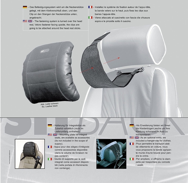 - Für Sitze mit integrierter Kopfstütze, z.B. Smart, Porsche etc. ist optional eine Halterung "SITBACK- integrale" als "Zubehör" erhältlich
