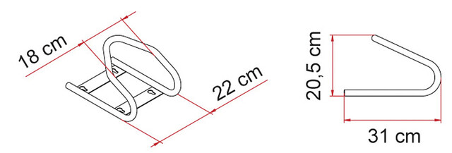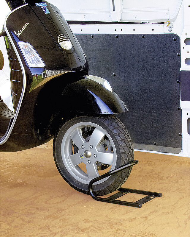 Reifenblockiersystem für Motorrad/-roller. Ermöglicht das Befestigen von Reifen bis max. 18 cm Breite. Schwarz lackierter Stahl.