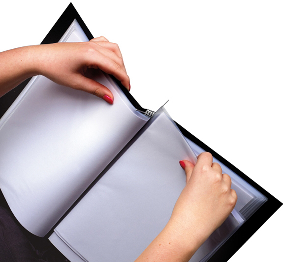 Blättern wie in einem Buch! Die Hüllen lassen sich einfach austauschen, die Mappe klappt nicht auf, die Seiten blättern nicht zurück. Platz- und gewichtssparender als alle andere Präsentationssysteme.