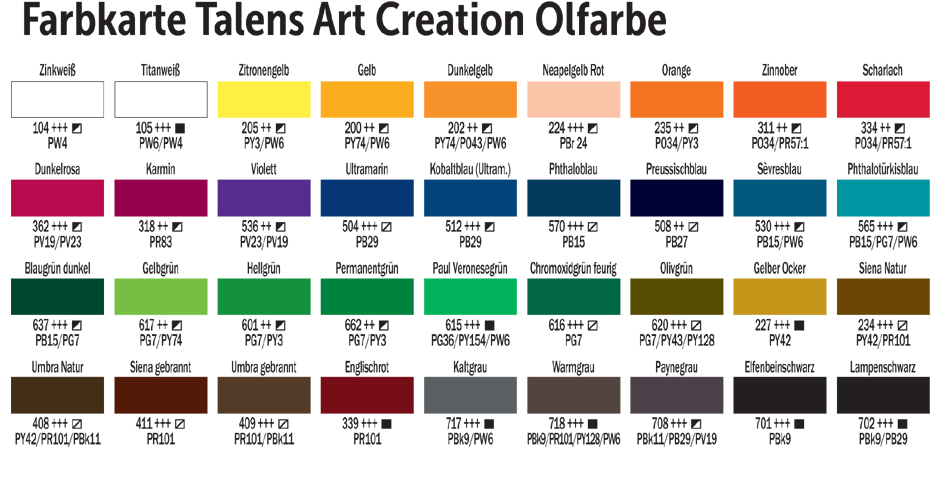 Titanweiß (105), Umbra gebrannt (409), Siena gebrannt (411), Lampenschwarz (702), Englischrot (339), Blaugrün dunkel (637), Elfenbeinschwarz (701)