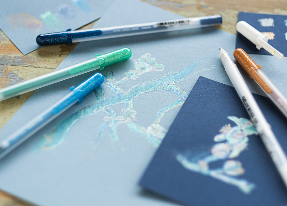 • die Metallicfarben haben einen magischen Glanzeffekt auf weißem, schwarzem und glänzendem Papier, während die deckende, weiße Tinte auf dunklen und farbigen Oberflächen hervorsticht und Highlights zur Geltung bringt
