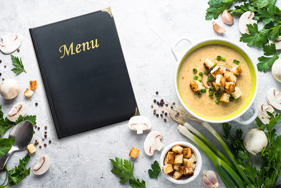 • 4 feste, nicht erweiterbare Hüllen zum Einlegen der Speisekarte