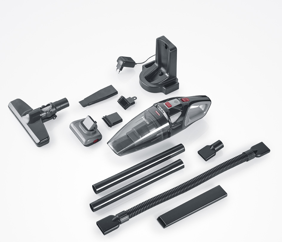 • Zubehör: Turbobürste, Fugendüse, Ladestation mit Wandhalterung, Tragetasche