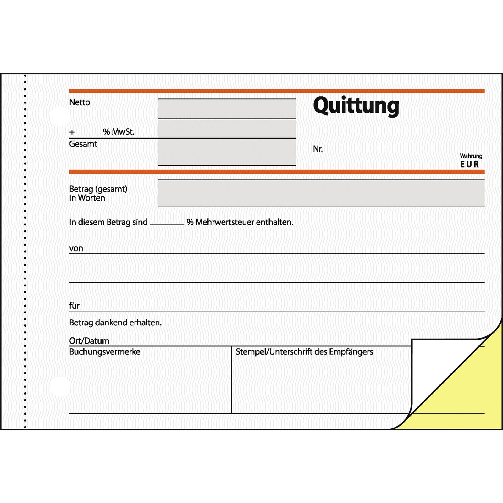Selbstdurchschreibendes Quittungs-Formular, Format A6 quer, mit MwSt.-Nachweis. Fälschungssicherer Dokumentendruck. Besonders anwenderfreundlich: Farbige Kopie, alle Blätter mit Abheftlochung und ultra-feiner Microperforation für leichtes und sauberes Abtrennen. Formularbuch mit besonders haltbarer Spezial-Rückenleimung und integrierter Schreibunterlage zum Einklappen.