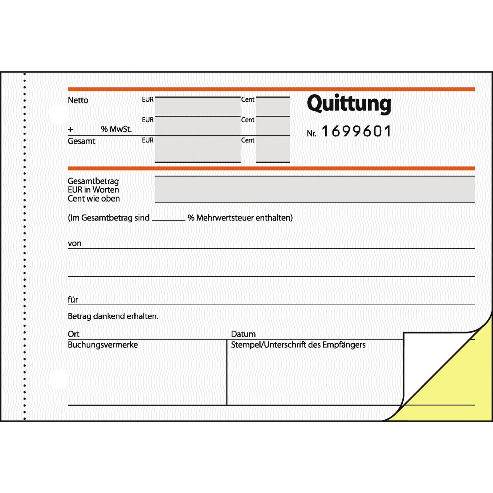 Selbstdurchschreibendes Quittungs-Formular, mit vorgedruckter 7stelliger Nummer zur eindeutigen Identifizierung. Formular fortlaufend nummeriert. Format A6 quer, mit MwSt.-Nachweis. Fälschungssicherer Dokumentendruck. Besonders anwenderfreundlich: Farbige Kopie, alle Blätter mit Abheftlochung und ultra-feiner Microperforation für leichtes und sauberes Abtrennen. Formularbuch mit besonders haltbarer Spezial-Rückenleimung und integrierter Schreibunterlage zum Einklappen.