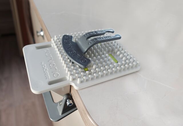 Wichtig: Benötigt wird als Basis die Noppenplatte oder der CLIP CLAP Getränke-/Tischklemmhalte. Die Handhabung ist wunderbar einfach. Und das mit einem Leichtgewicht von 10 g.Aufstecken, anpassen, fertig – nie ging es unkomplizierter und platzsparender.