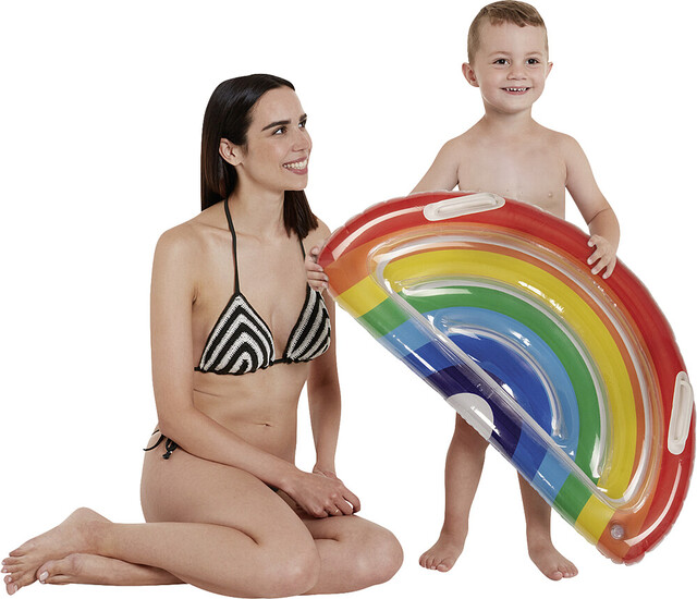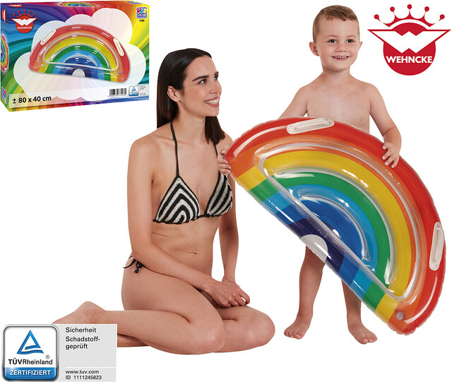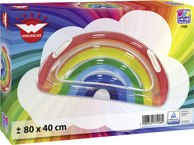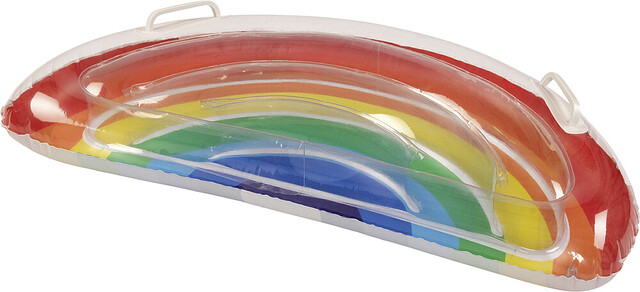 Aufgeblasen ca. 80 x 40 cm, Oberseite transparent, Unterseite innen mit Regenbogenfarben, 2 Haltegriffe.