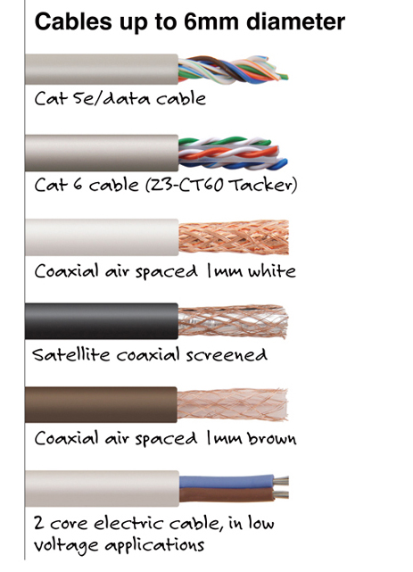 - mit den CT-60 Klammern: zum Befestigen von Kabeln bis zu einem Durchmesser von 6 mm - z.B. Cat5e Datenkabel, Cat6 Datenkabel, Koaxialkabel, Satellitenkabel, 2-adriges Stromkabel