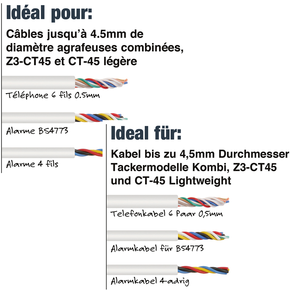 - mit den CT-45 Klammern: zum Befestigen von Telefonkabeln, 8-adrigen und 4-adrigen Datenkabeln
