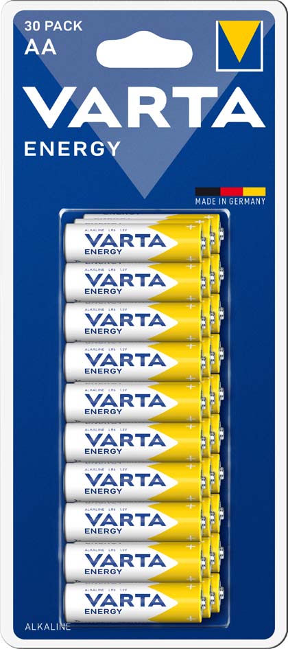 • Lieferumfang: VARTA Energy Mignon (AA) Alkaline Batterie, 4 bzw. 30 Stück, in Blisterpackung
