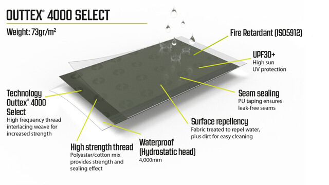 - Outtex® 4000 Select ist ein strapazierfähiges, hochwertiges Material aus reinem Polyester und bietet alle wesentlichen Eigenschaften, die Camper für den Alltag auf dem Campingplatz erwarten. Es ist flammhemmend und verfügt über eine PU-Beschichtung.